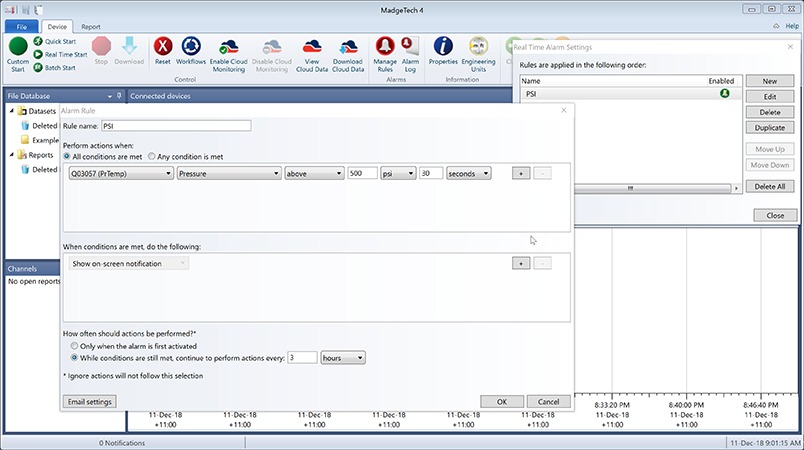 - The frequency of recording can also be configured however it has been factory set to monitor operating pressures every 60 seconds – reports become very large when set to shorter periods i.e. right down to every second.